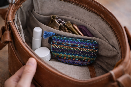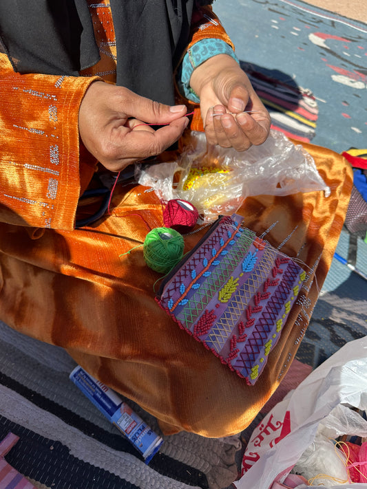 Unikt utvalg av vesker og punger i tradisjonelt beduin håndarbeid.