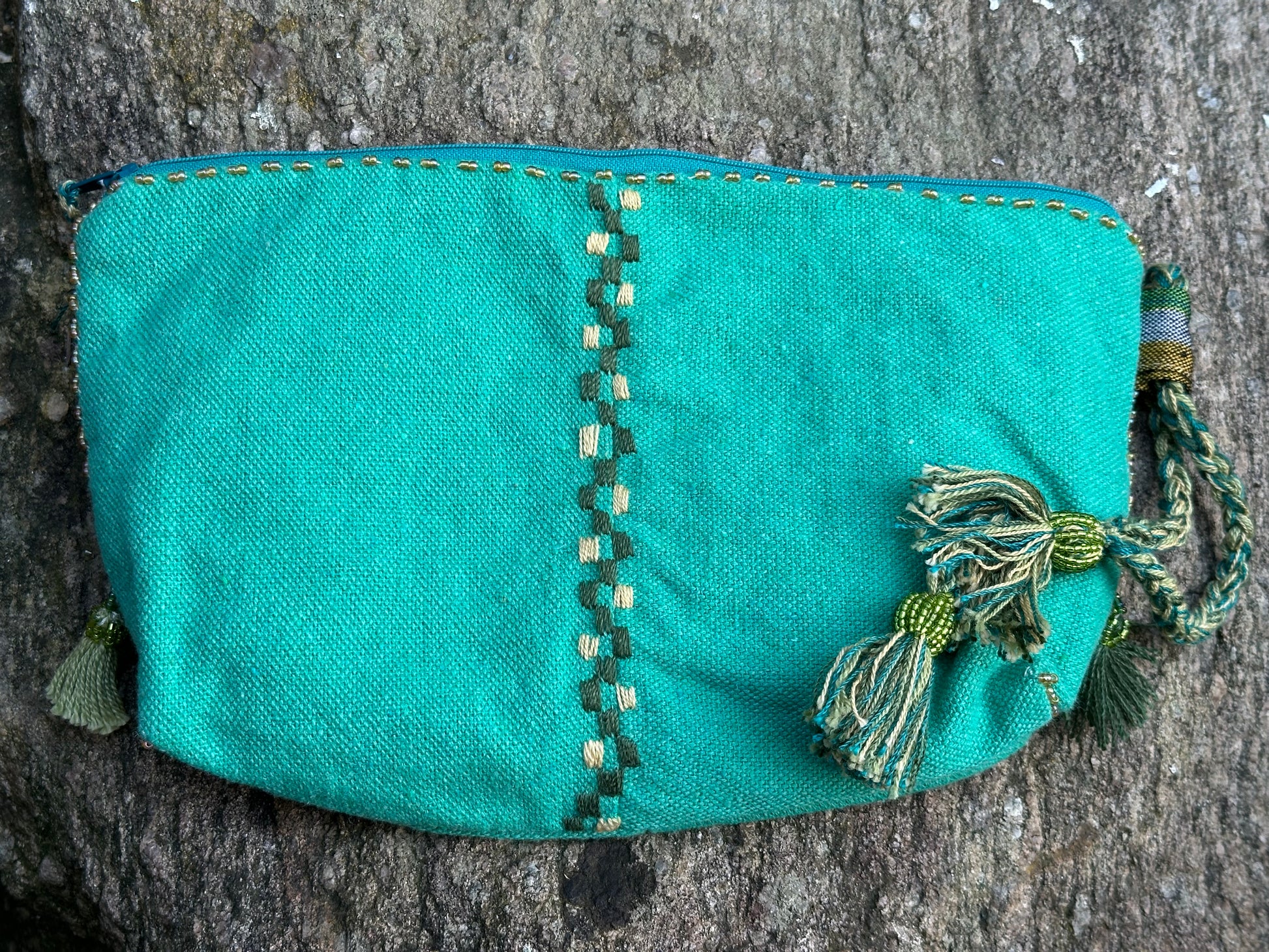 Lekker clutchveske som er vakkert og rikt brodert med små perler og dekorative dusker. Vesken har et stort rom som er foret og med glidelås. Flettet håndtak med vakre dusker. Vakre fargetoner i turkisgrønt og gull. Den måler ca 28 x 15 cm.