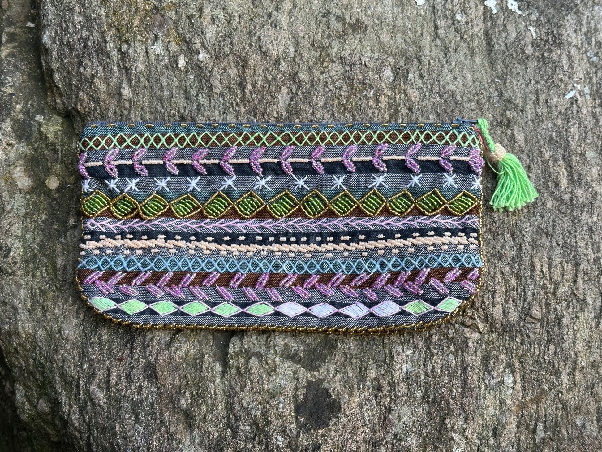 Nydelig avlang veske som er vakkert og rikt brodert med små perler, foret og med glidelås med dusk. Den måler ca 21 x 11 cm.
