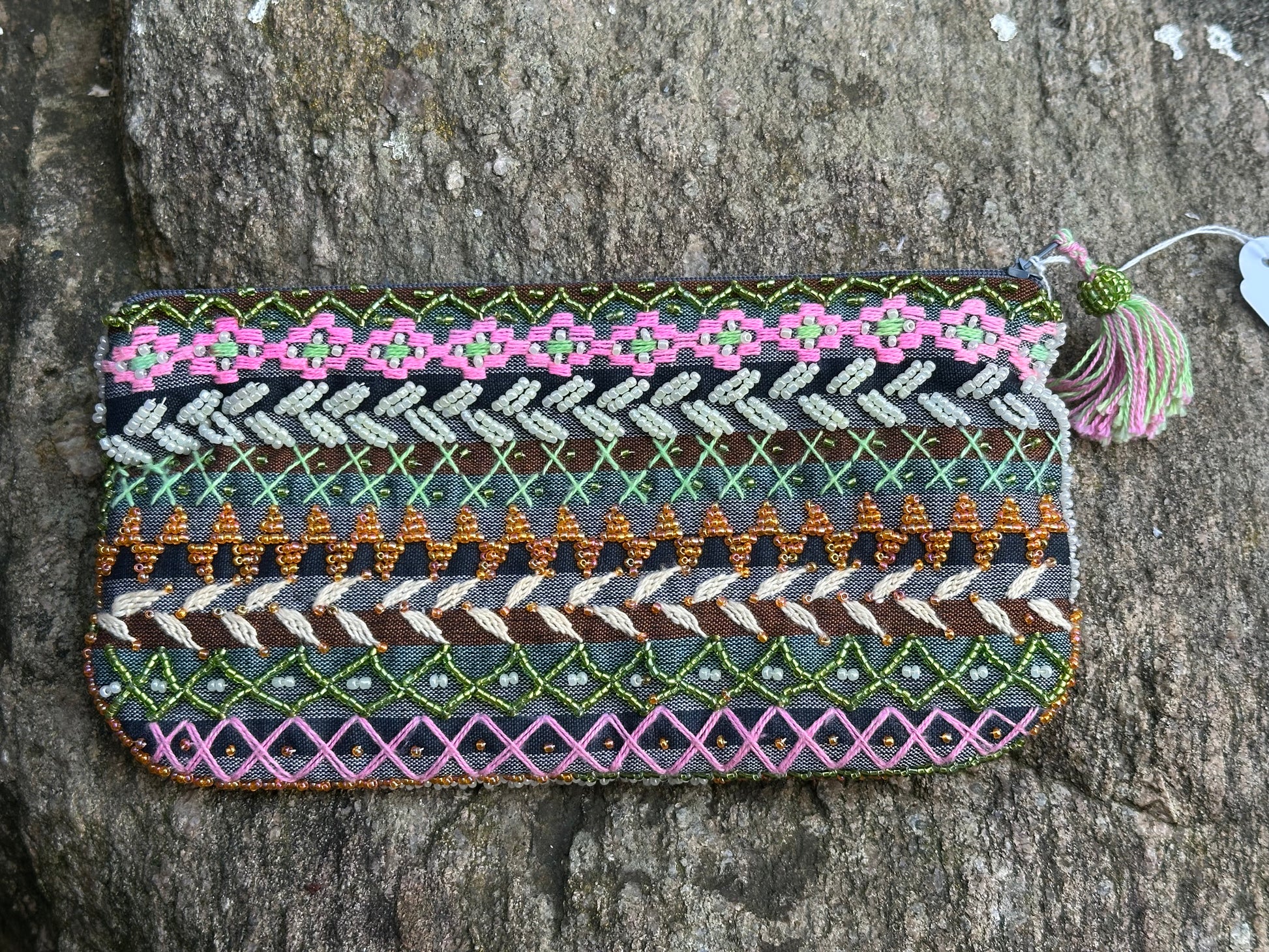 Nydelig avlang veske som er vakkert og rikt brodert med små perler, foret og med glidelås med dusk. Den måler ca 21 x 11 cm.