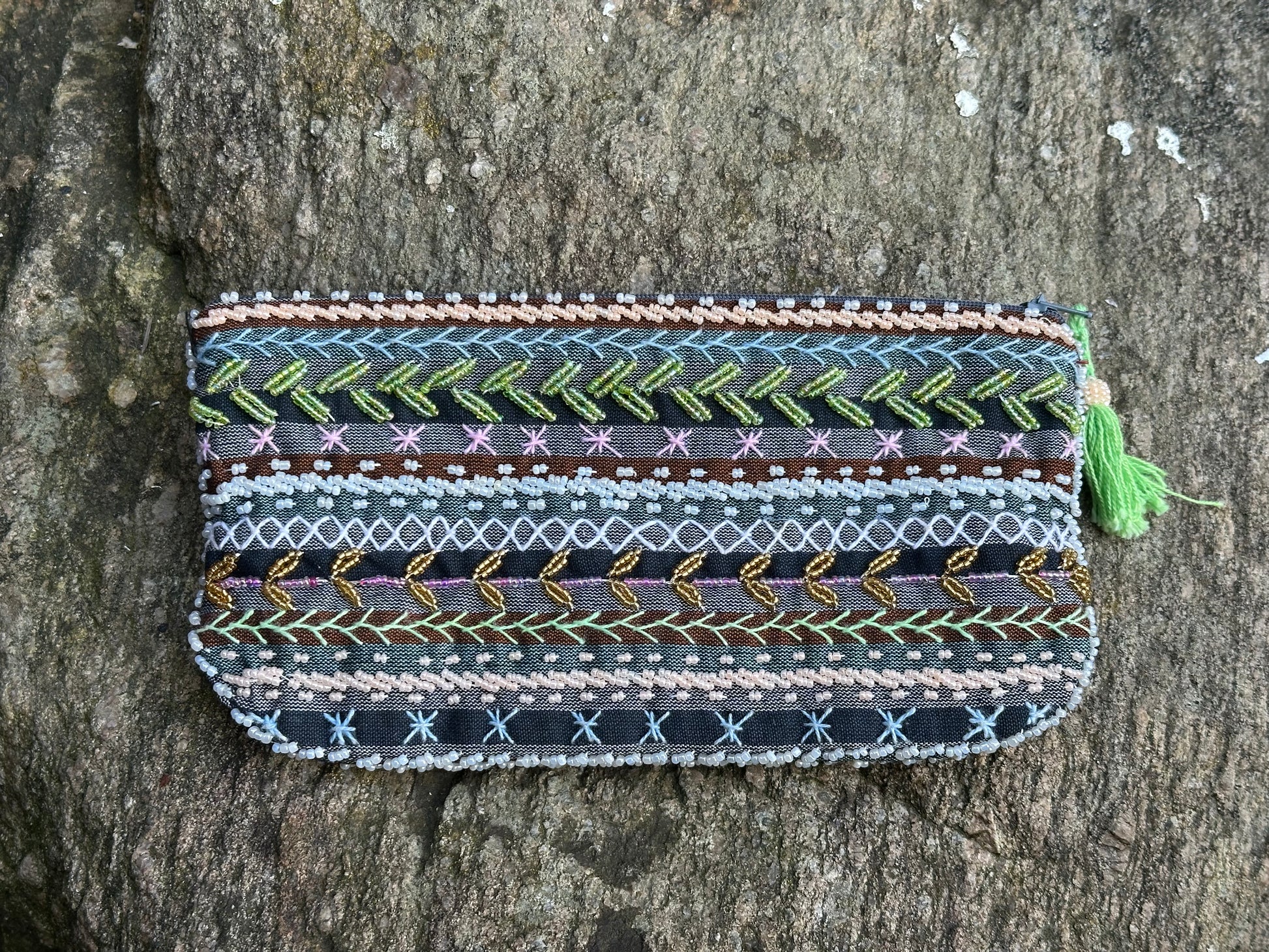 Jeg Nydelig avlang veske som er vakkert og rikt brodert med små perler, foret og med glidelås med dusk. Den måler ca 22 x 12 cm.
