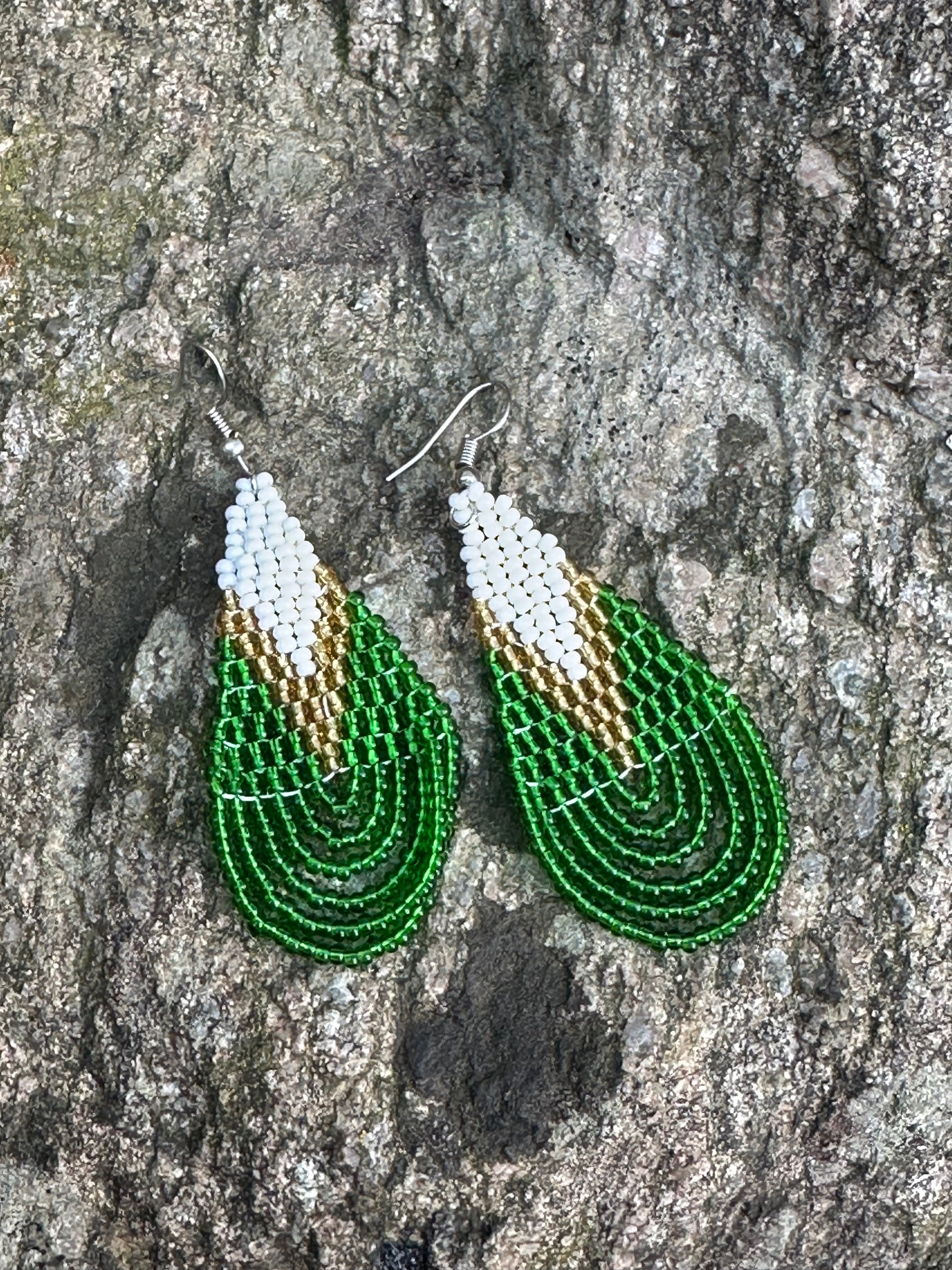 Perlede øredobber i grønt, hvitt og gull. Mål 56x30 mm.