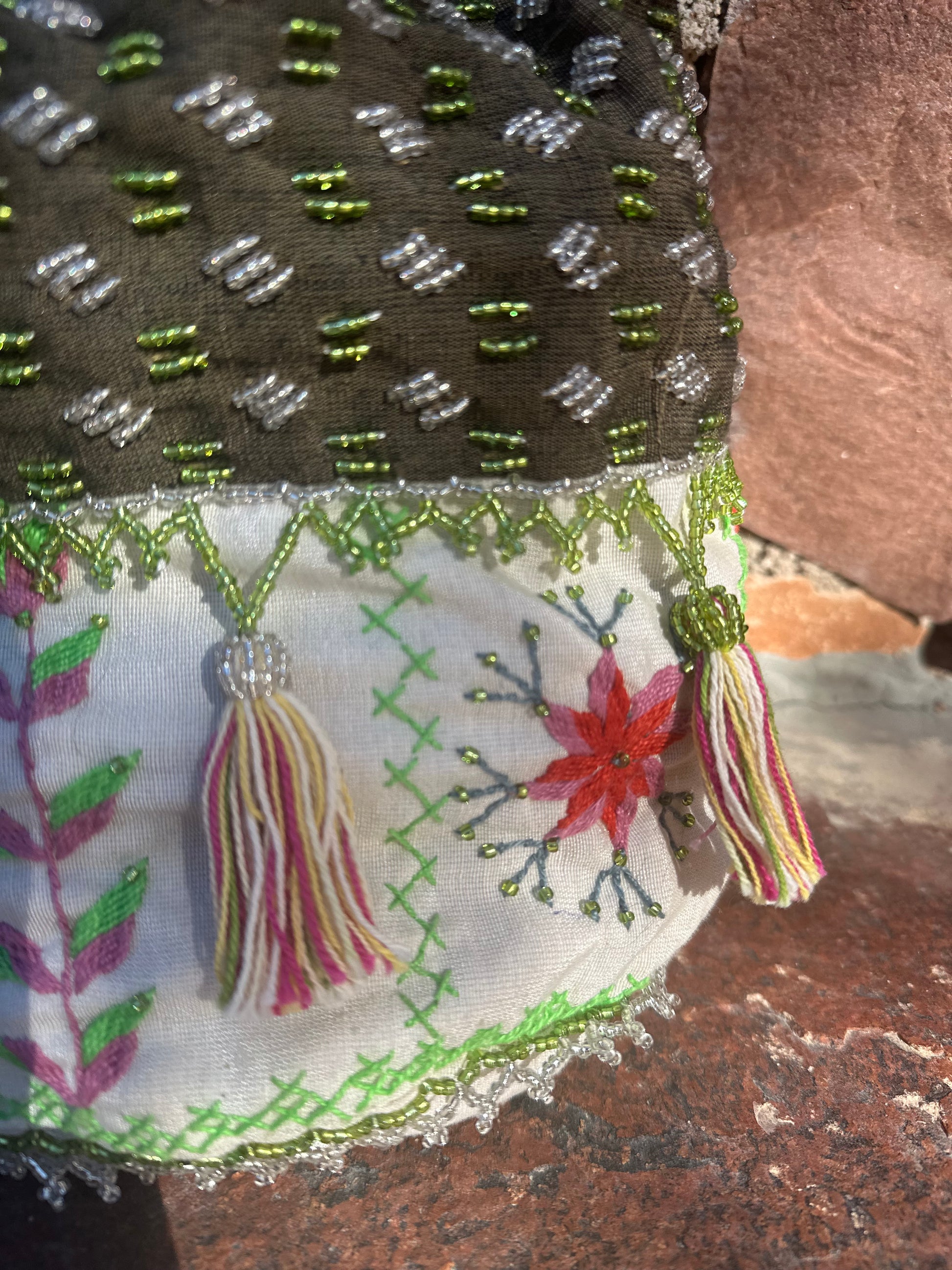 Dette er unikt tradisjonelt håndarbeid fra beduin kvinner i områdene rundt St. Catherine i Sinai fjellene. Dette håndarbeidet gir et viktig bidrag til familieøkonomien. Overskuddet fra vår handel går tilbake til kvinnene i form av nye materialer, designutvikling o.l. 🩷