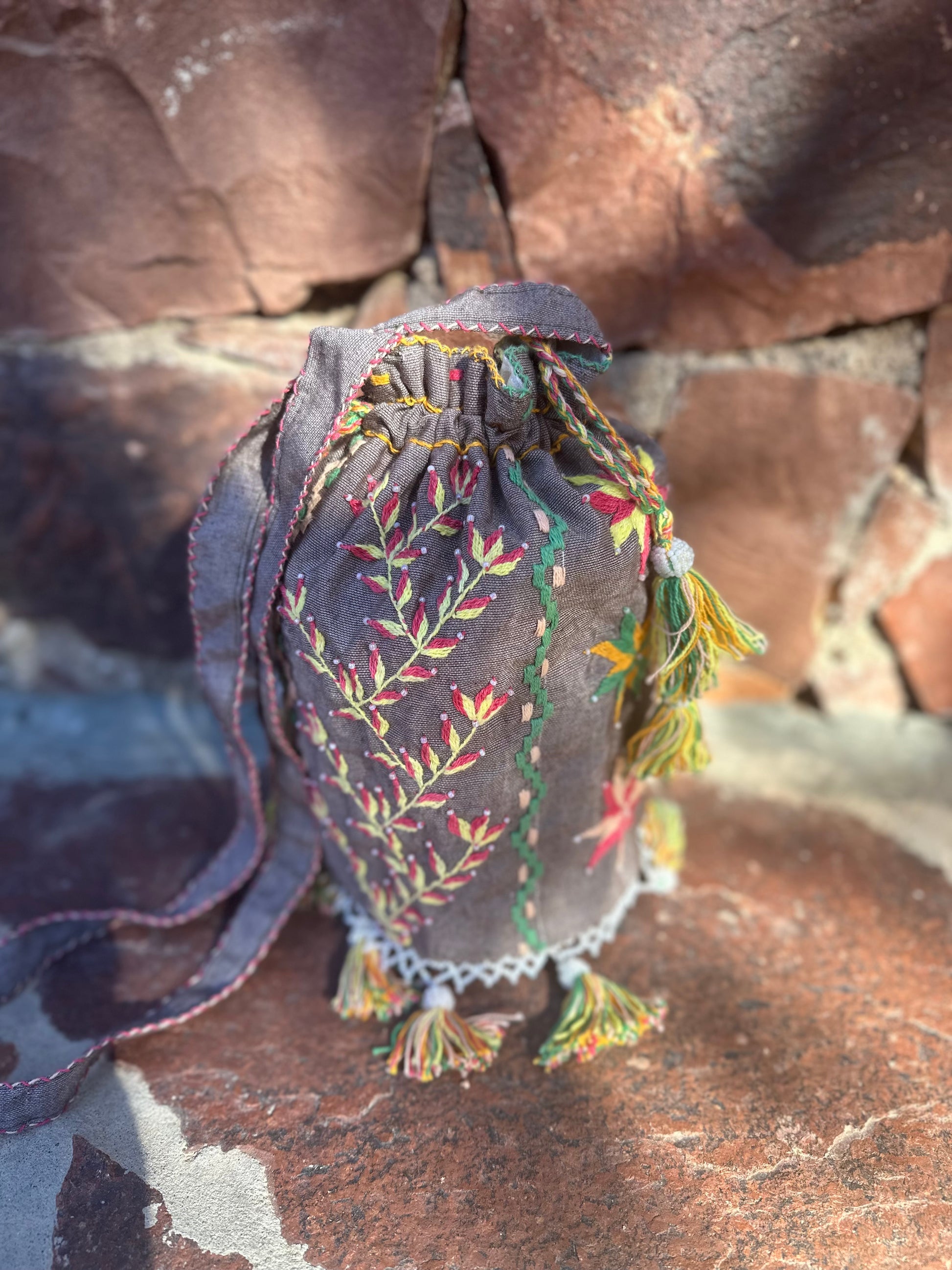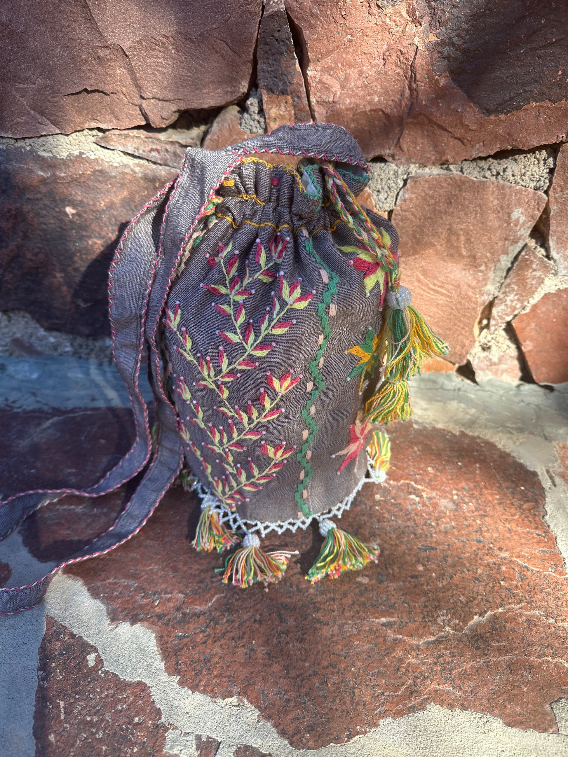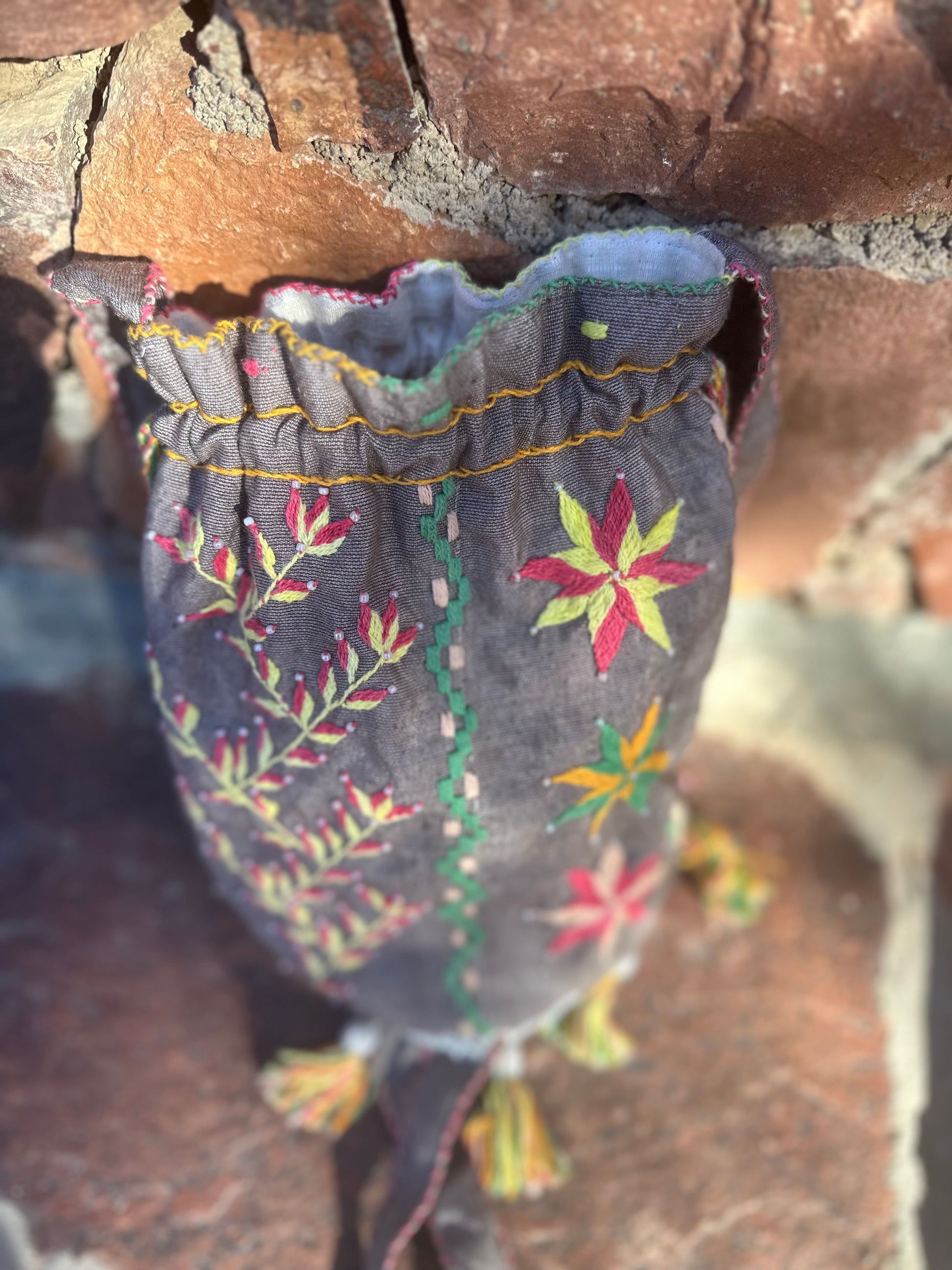 Kul «pompadour» veske som er rikt brodert med plantemotiv fra Sinai. Vesken er foret, har fine dusker og skulderem. Den snøres igjen. Den måler ca 26 cm i dybde og 16 cm i omkrets. En kul selskapsveske! Eller hva med å bruke den til ditt fine håndarbeidsprosjekt?