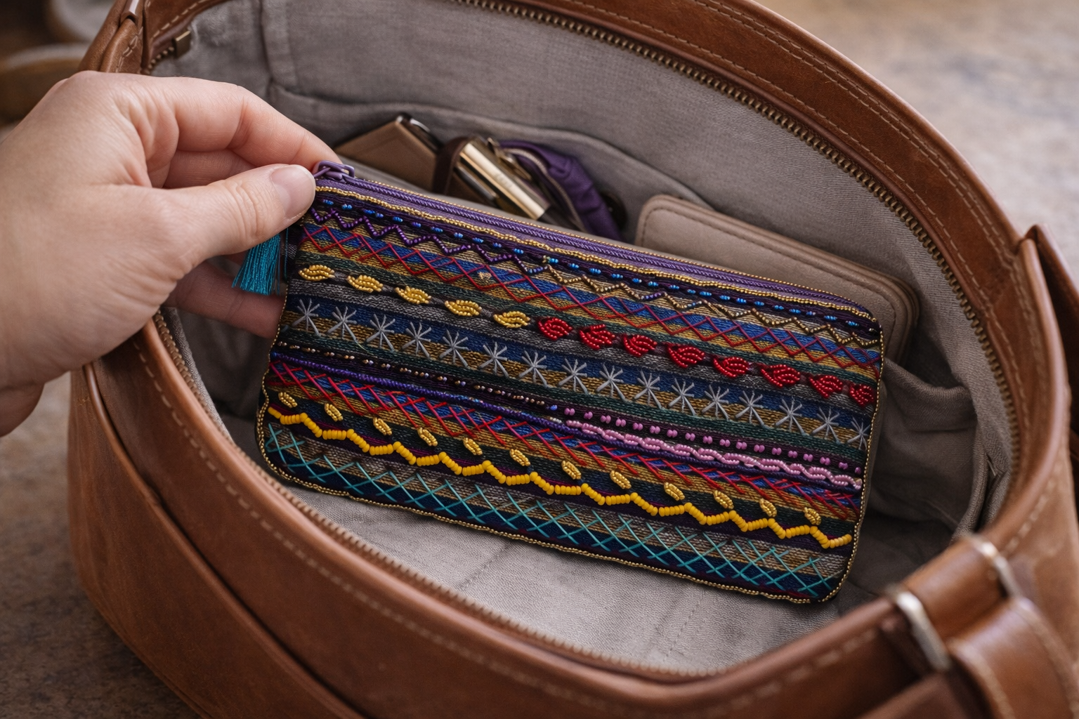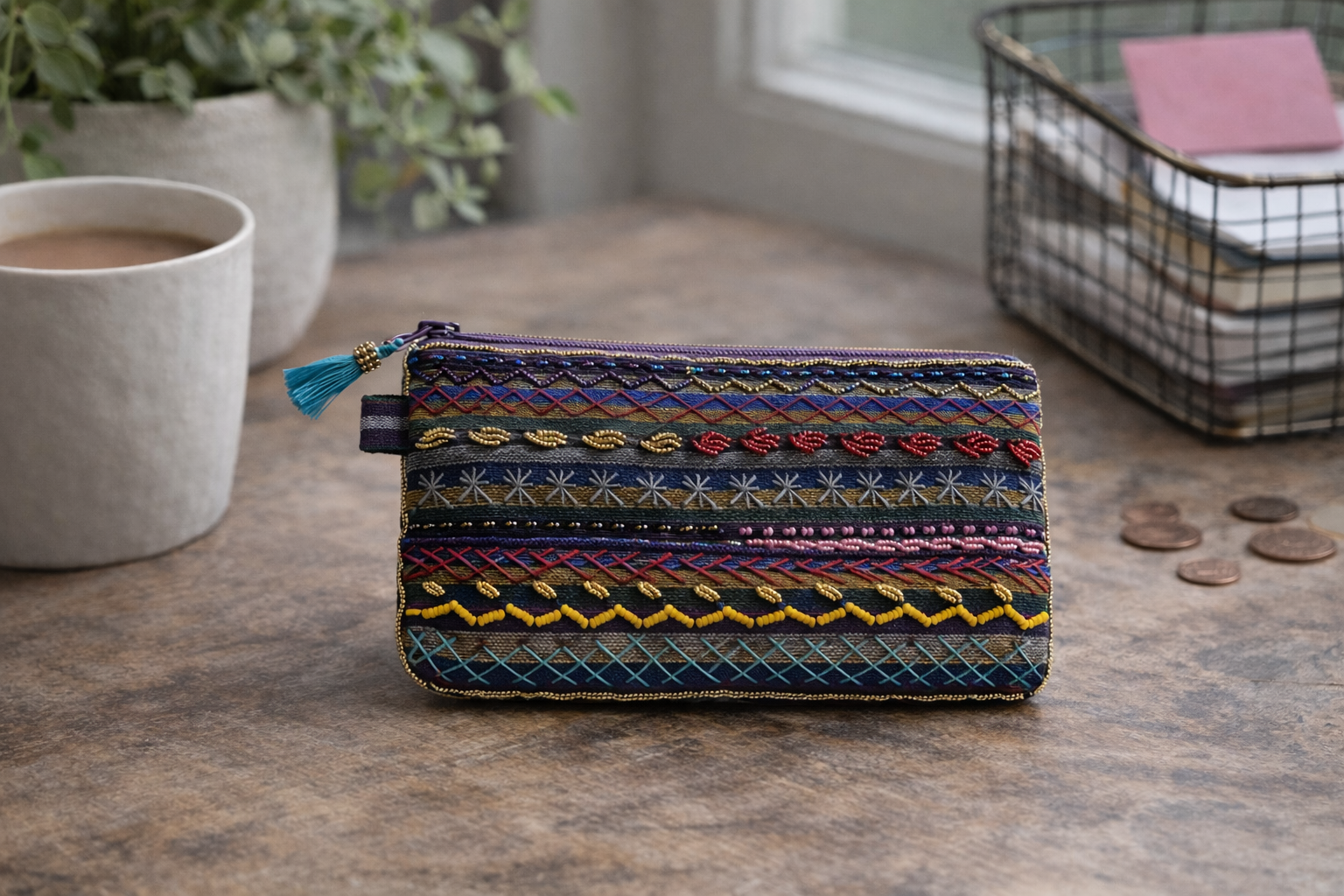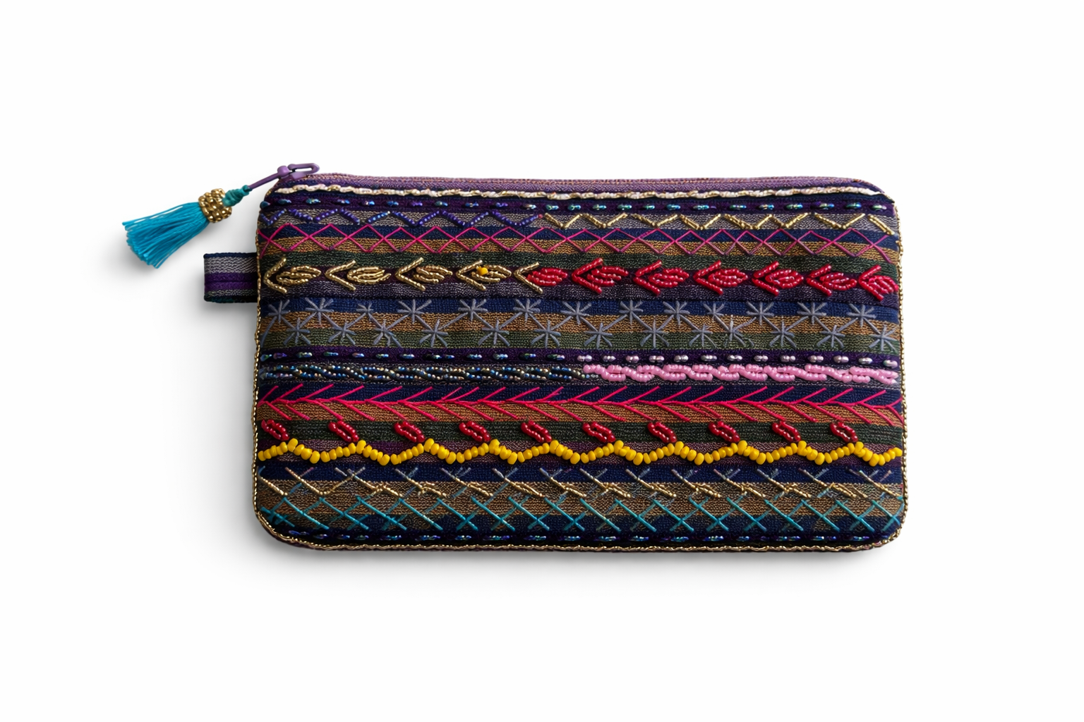 Nydelig pung som er vakkert og rikt brodert med små perler, foret og med glidelås med dusk. Den måler ca 20 x 10 cm. Disse er perfekte som en liten veske i veska, til kort og penger, til sminken, og andre fine småting man bærer med seg🌸