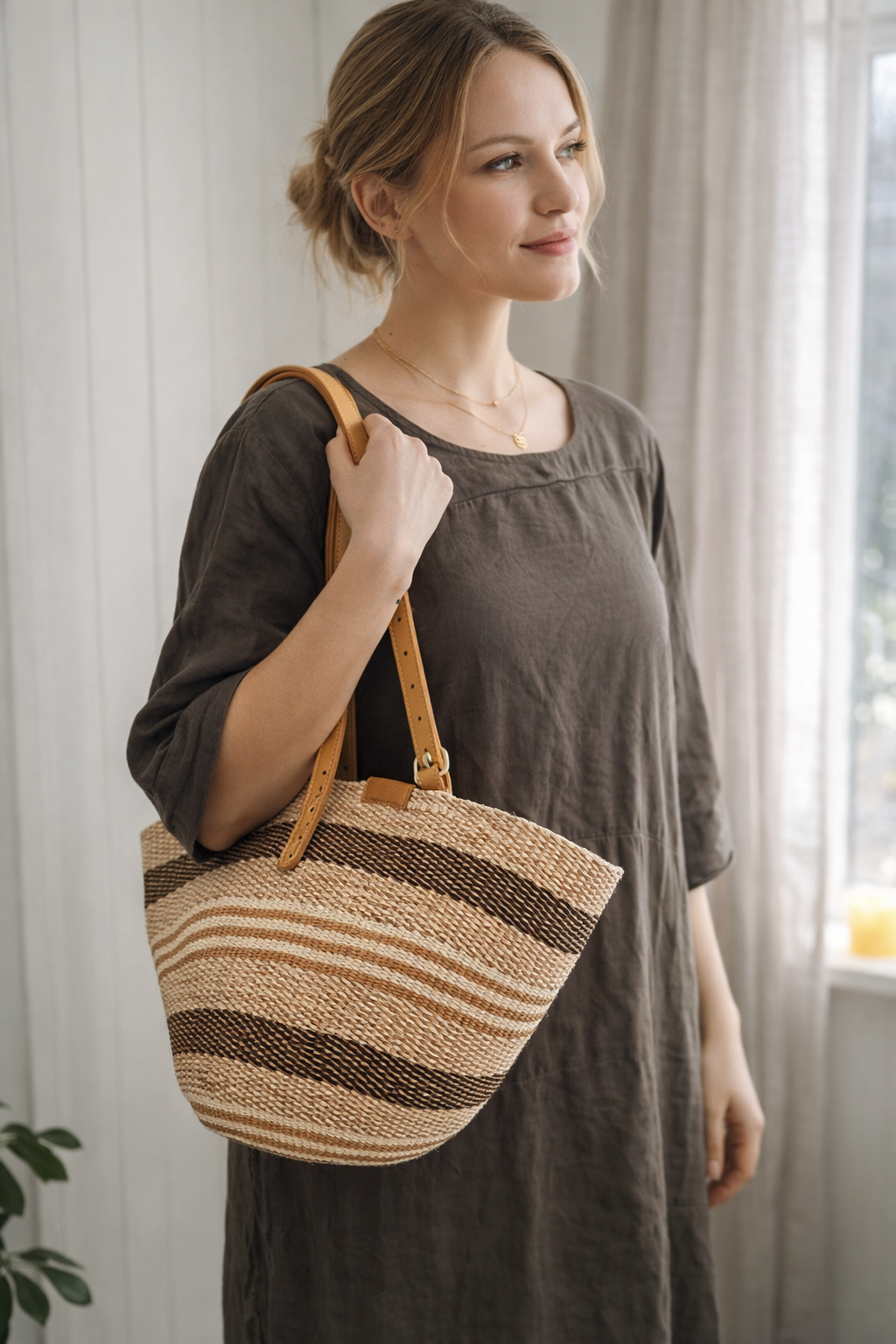 Lekker skulderveske i sisal og lær fra Kenya. Her møtes veldig godt håndarbeid med design og funksjonalitet! Vesken er flettet av sisal, har reimer av skinn og en praktisk lukker. Vesken måler ca 48 x 28 cm. Regulerbare skinnreimer. Du får vesken som vises på bilde 1.