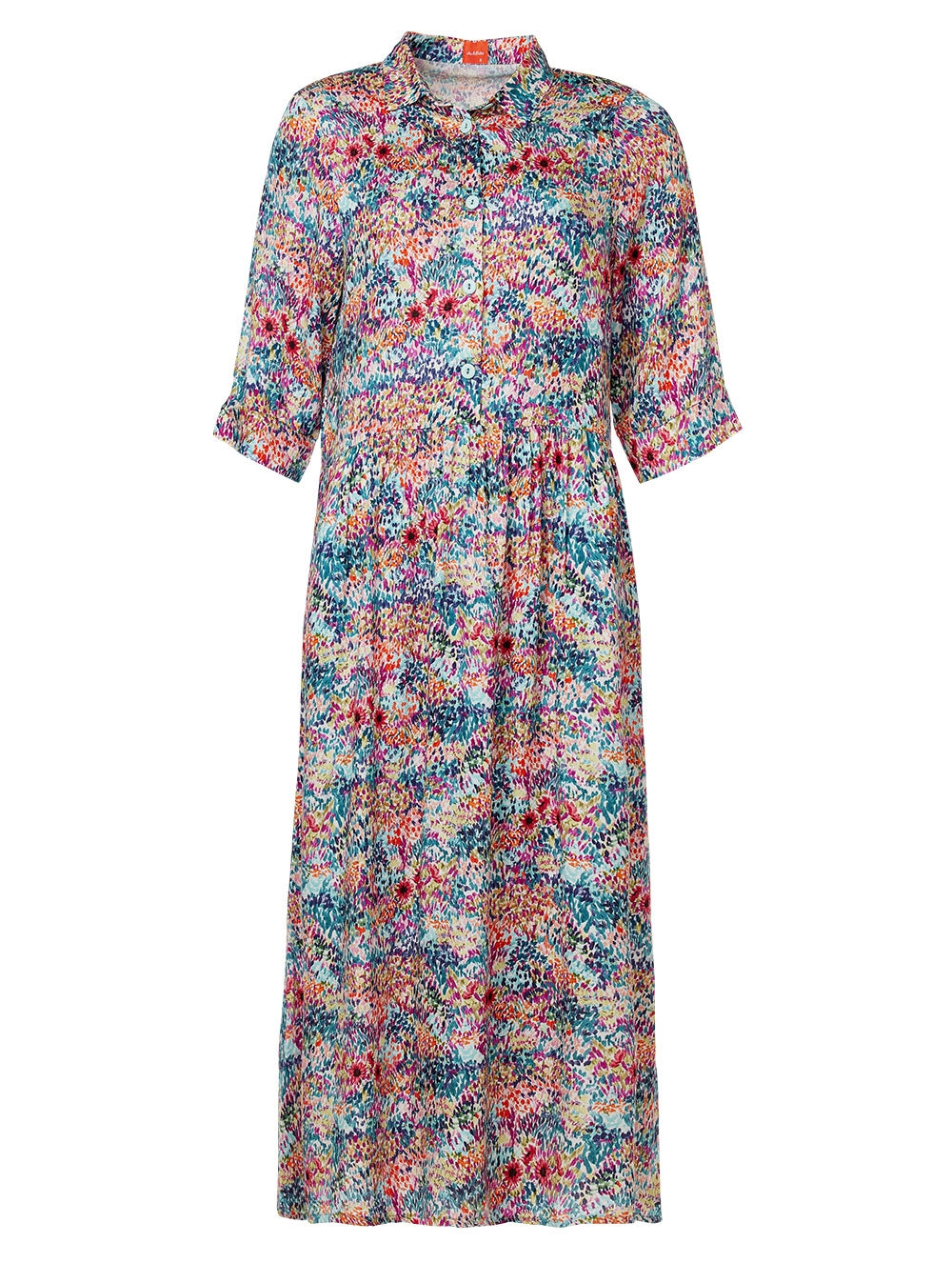 DuLine er en løsere kjole med en fin liten skjortekrage og knapper i øvre del. . Kjolen har en skjæring under brystet med flere små legg som gir ekstra vidde til skjørtet. En nydelig deilig kjole!