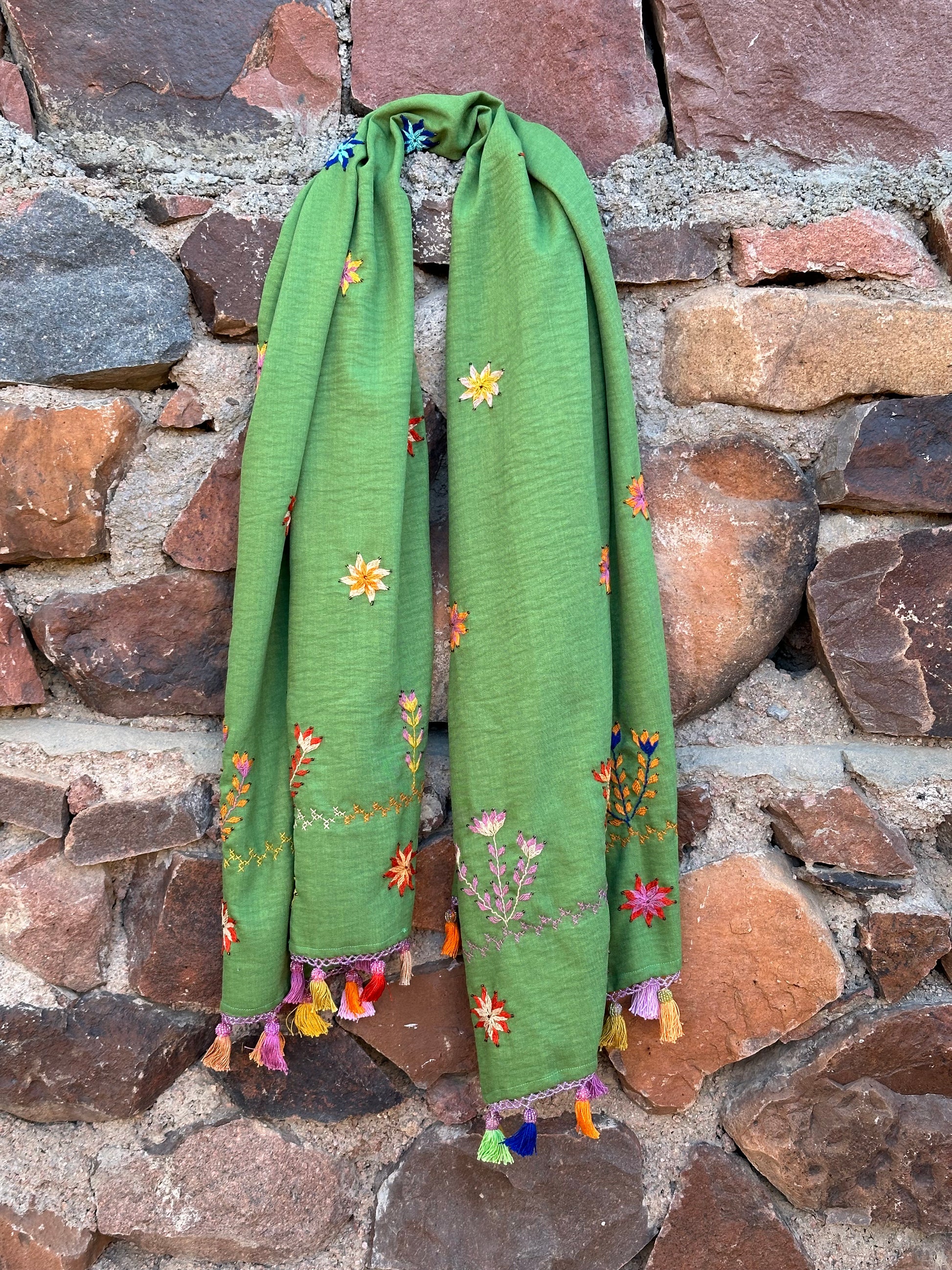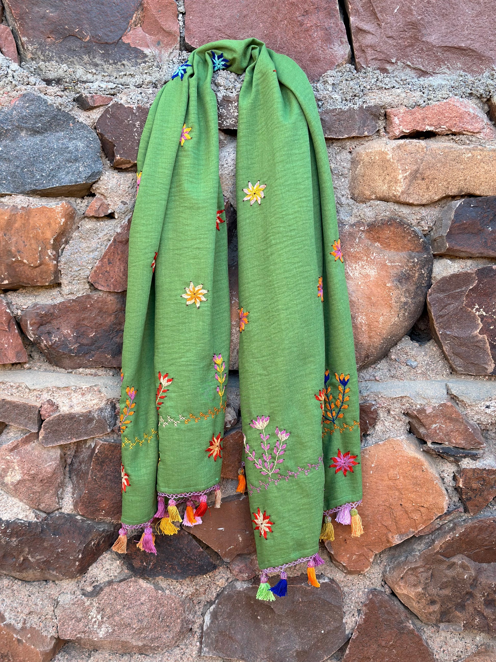 Vakkert stort sjal i viscose/lin blanding som er nydelig brodert med blomster og perler. Sjalet måler ca 180 x 70.