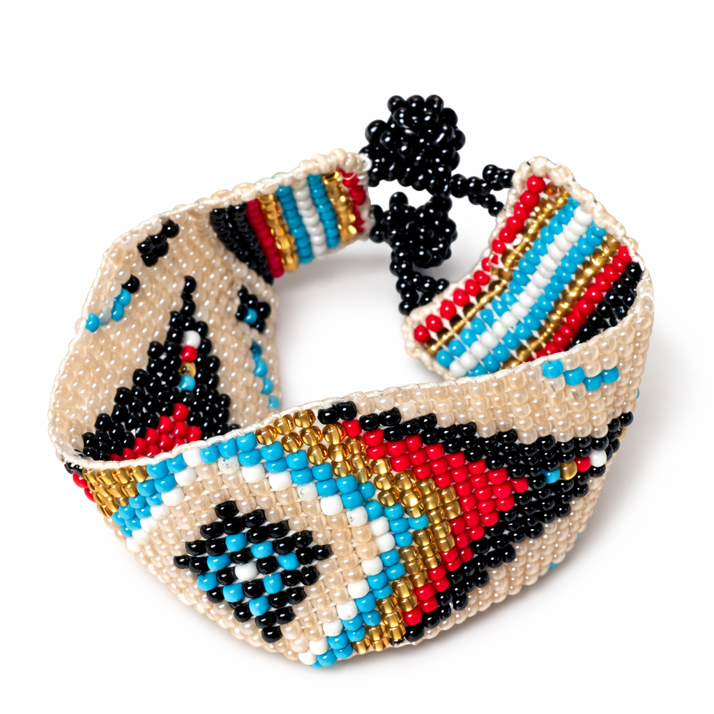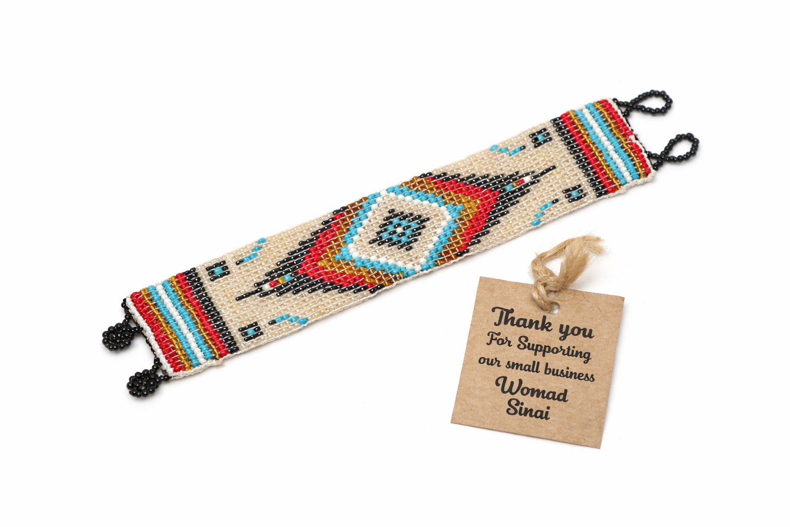 Lekkert håndlaget armbånd som gir et tydelig inntrykk på håndleddet ditt. Det er kjærlig håndperlet av dyktige beduinkvinner fra Nuweiba i Sør-Sinai. Armbåndet er perlet på sterk tynn silketråd og kjennes mykt å ha på. Det har en enkel og flott låsemekanisme og det måler ca 19 x 3 cm fra låsende til låsende. Designet er inspirert av tradisjonelle tepper fra Sinai. Høykvalitets glassperler.