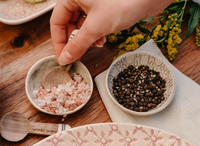 Vakker keramikk skål fra Wonki Ware. Disse salt skålene måler ca. 9 cm i dia og ca 3 cm høyde. Alt fra Wonki Ware er håndlaget og ingen skåler er helt like - det er derfor vi elsker de! Perfekt til tapas og taco!